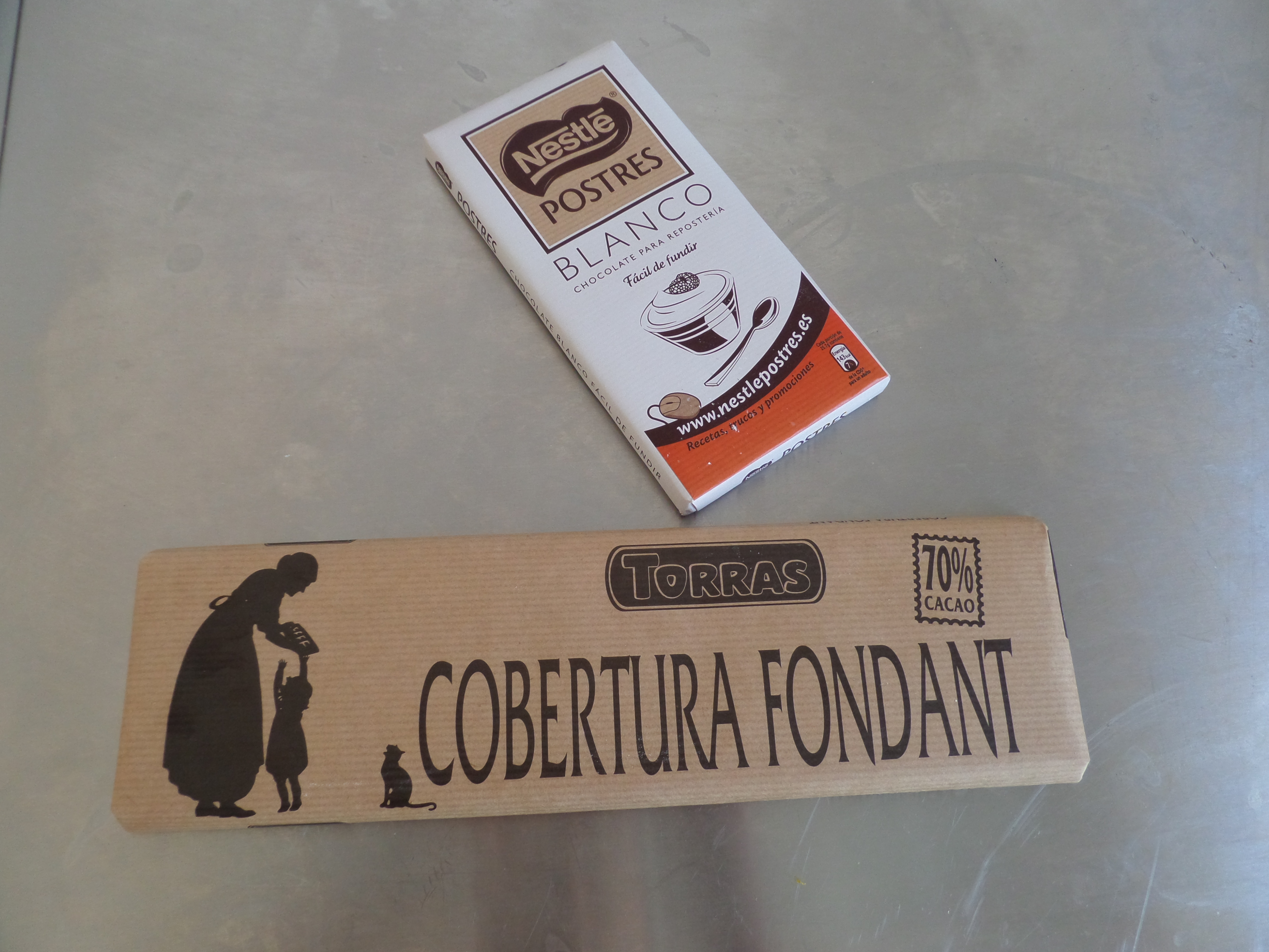 Els ingredients són xocolata negra i xocolata blanca de cobertura. Els podem trobar a qualsevol supermercat.