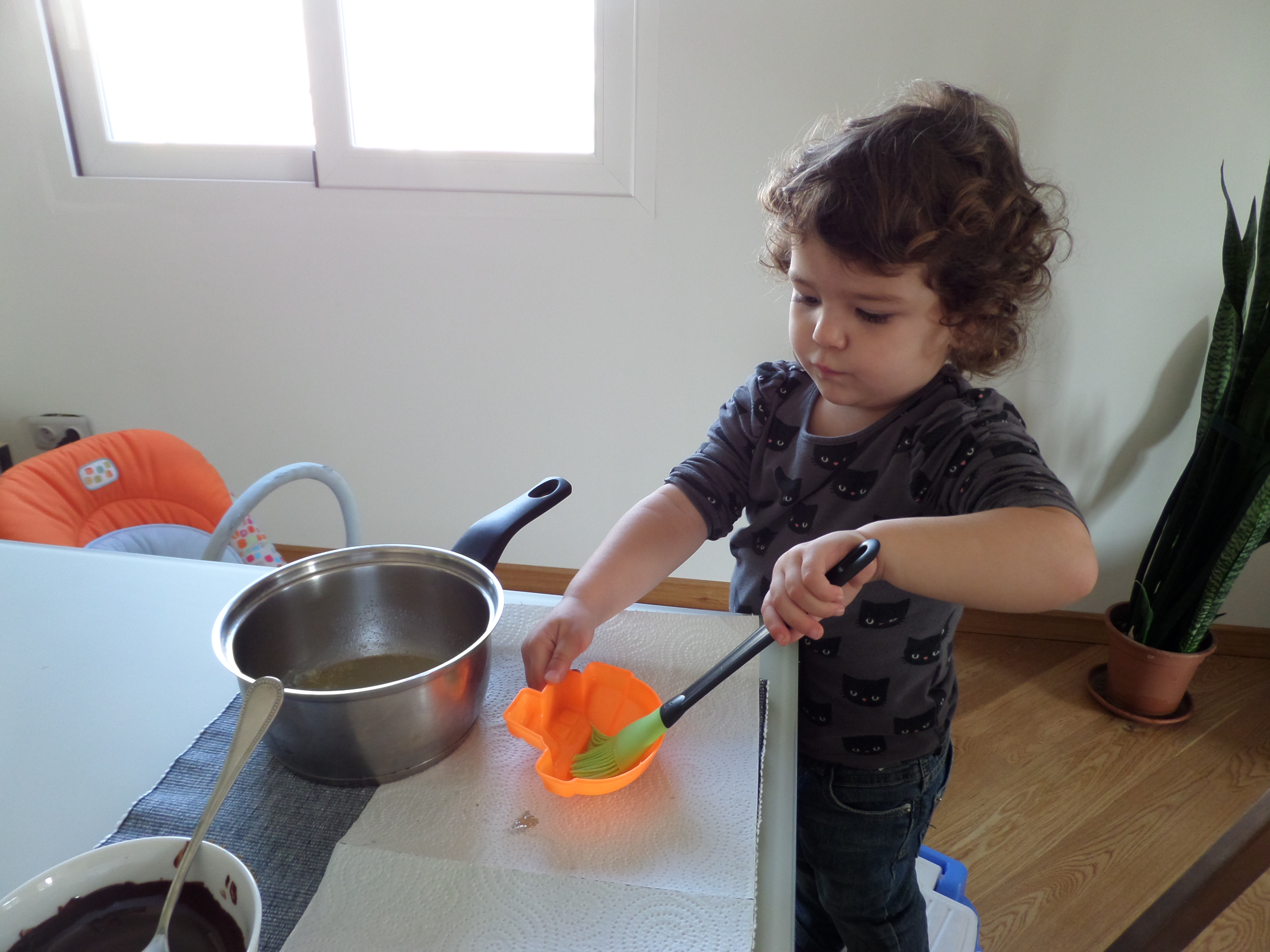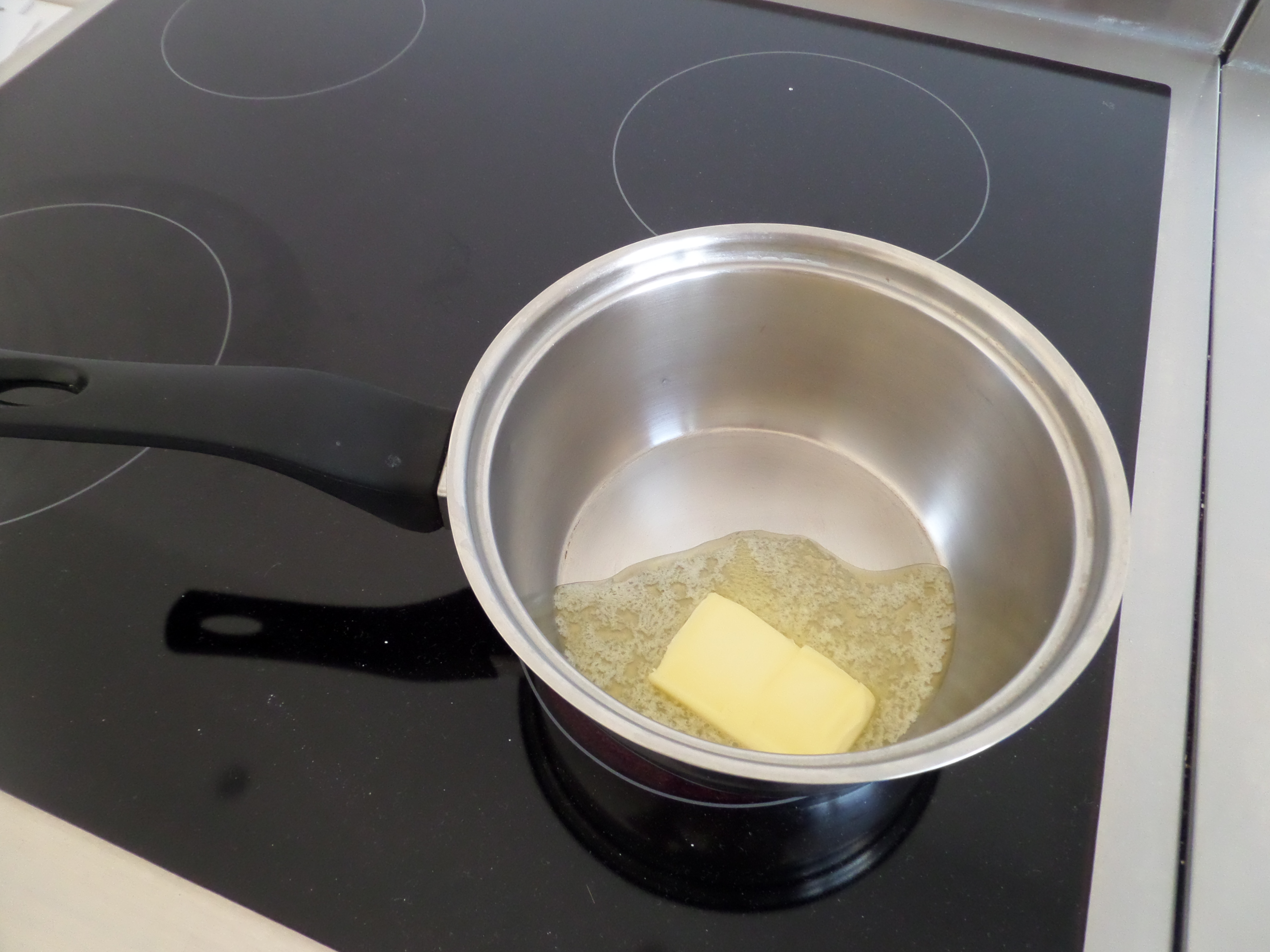 Primer escalfem una mica de mantega (la farem servir per pintar els motlles i que no s’enganxi tant la xocolata). Penso que si fem servir motlles de silicona no és necessari i a més a més, la superfície de la figureta quedarà més llisa.