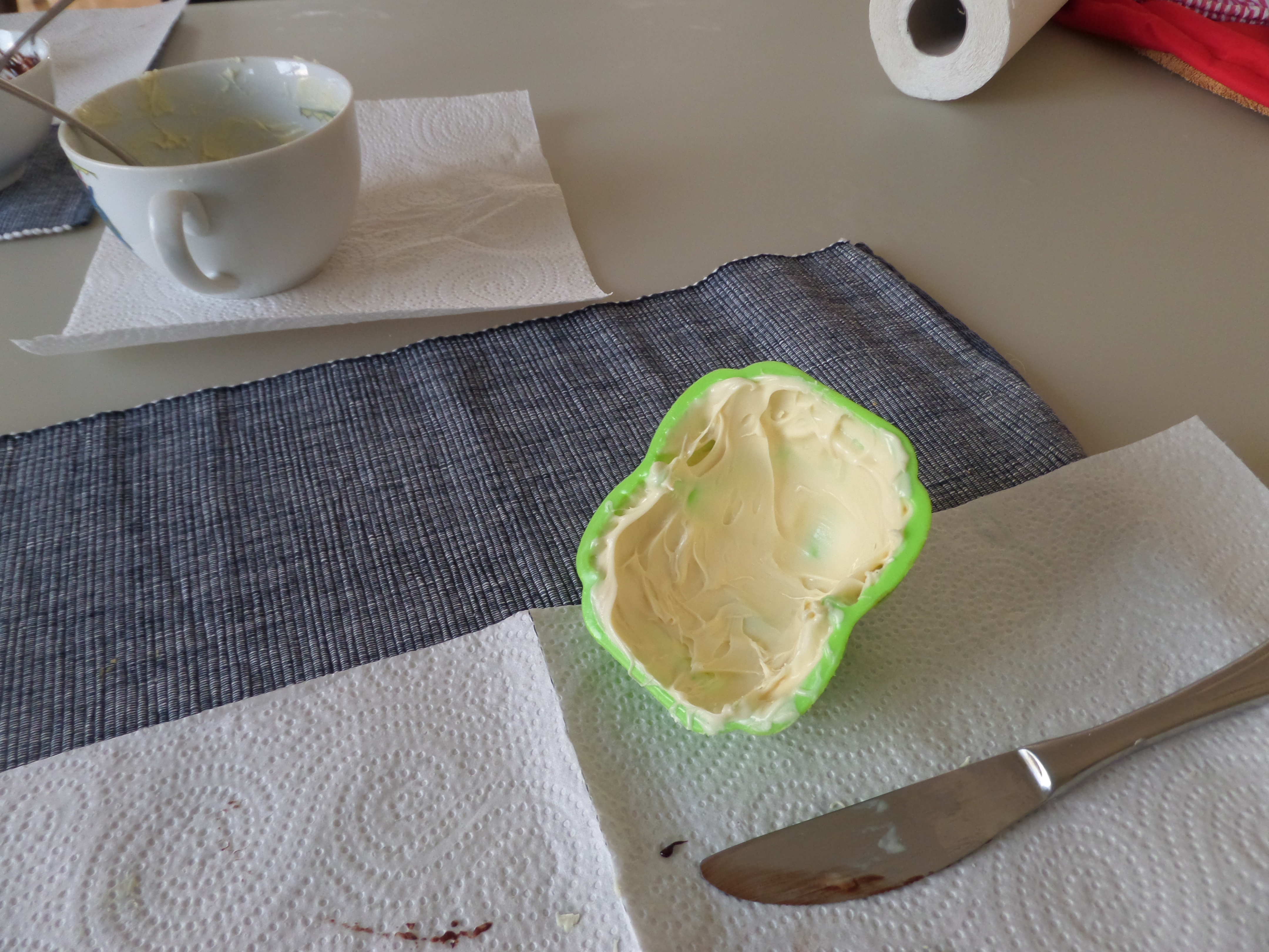 Primer pintem amb mantega l’interior dels motlles. La mantega tampoc a d’estar massa líquida. Si ho està, un cop pintat, escorrem el motlle.