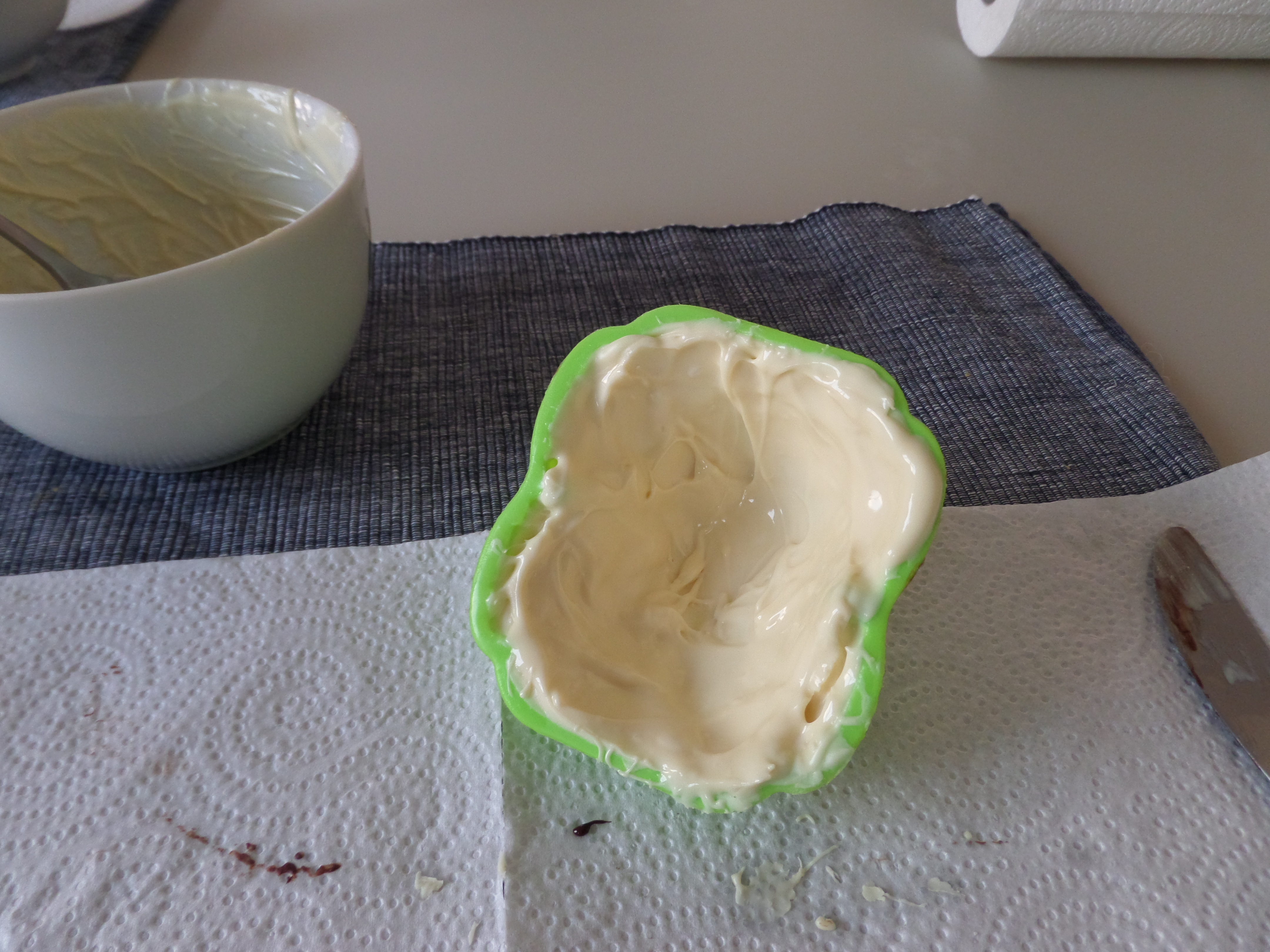 Després posem la xocolata. Ens ajudem amb un ganivet (o una espàtula, si en tenim) per fer-la caure de la cullera i distribuir-la per l’interior del motlle en una capa fina.